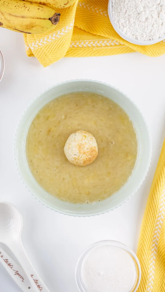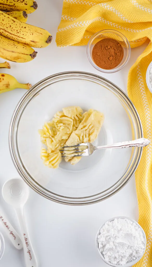 - If you’re choosing to coat your donut holes in the banana glaze, add a small banana to a small bowl and mash thoroughly using a fork.