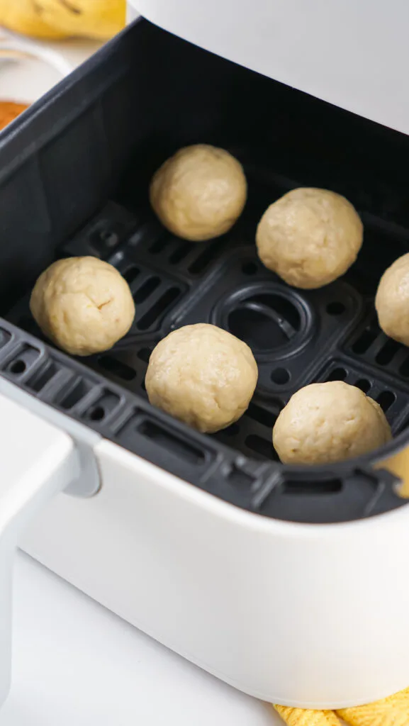 Spray your air fryer basket with nonstick cooking spray. Place the dough balls in the basket about 1 inch apart, as they expand while cooking. Aim for around six balls at a time, depending on the size of your air fryer.